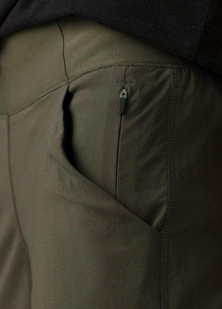 - Pull-on design with knit jersey waistband featuring a hidden pocket